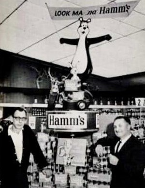 This spectacular Hamm's display, the first of its kind and featuring the bear on a motor scooter, was installed in the Jay Vee Liquor store in Berkeley, Calif., one of the largest retail stores of its type in the state.